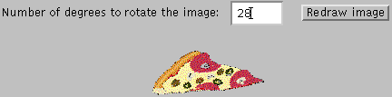 The following applet uses a filter to rotate an image. The filter is a custom one named RotateFilter that you'll see discussed on the next page. All you need to know about the filter to use it is that its constructor takes a singledoubleargument: the rotation angle in radians. The applet converts the number the user enters from degrees into radians, so that the applet can construct a RotateFilter.