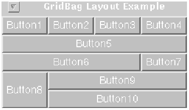 The following figure shows ten components (all buttons) managed by a grid bag layout: