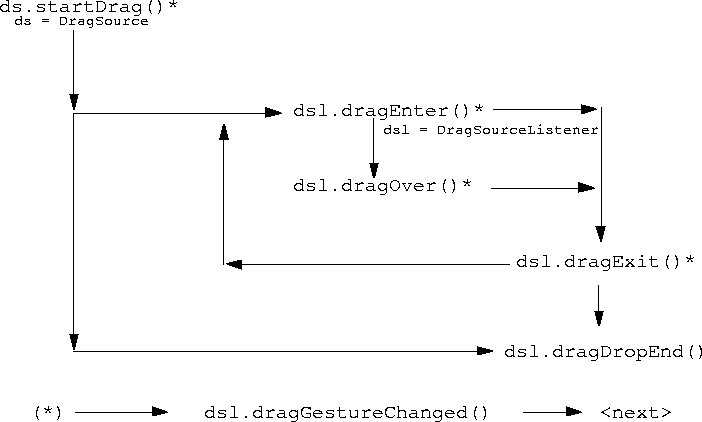 As the drag operation progresses, the DragSourceListener's dragEnter(), dragOver(), and dragExit() methods shall be invoked as a result of the users navigation of the logical "Drag" cursor's location intersecting the geometry of GUI Component(s) with associated DropTarget(s). [See below for details of the DropTarget's protocol interactions].