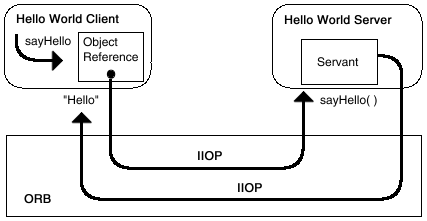 This tutorial teaches the basic tasks in building a CORBA distributed application using Java IDL. You will build the classic "Hello World" program as a distributed application, with both applet and application clients.The Hello World program has a single operation that returns a string to be printed. Its basic function is illustrated below: