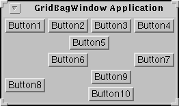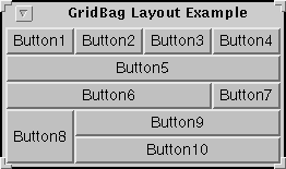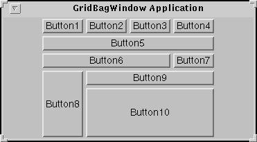 protected void makebutton(String name, GridBagLayout gridbag, GridBagConstraints c) { Button button = new Button(name); gridbag.setConstraints(button, c); add(button); } public GridBagWindow() { GridBagLayout gridbag = new GridBagLayout(); GridBagConstraints c = new GridBagConstraints(); setFont(new Font("Helvetica", Font.PLAIN, 14)); setLayout(gridbag); c.fill = GridBagConstraints.BOTH; c.weightx = 1.0; makebutton("Button1", gridbag, c); makebutton("Button2", gridbag, c); makebutton("Button3", gridbag, c); c.gridwidth = GridBagConstraints.REMAINDER; //end of row makebutton("Button4", gridbag, c); c.weightx = 0.0; //reset to the default makebutton("Button5", gridbag, c); //another row c.gridwidth = GridBagConstraints.RELATIVE; //next to last in row makebutton("Button6", gridbag, c); c.gridwidth = GridBagConstraints.REMAINDER; //end of row makebutton("Button7", gridbag, c); c.gridwidth = 1; //reset to the default c.gridheight = 2; c.weighty = 1.0; makebutton("Button8", gridbag, c); c.weighty = 0.0; //reset to the default c.gridwidth = GridBagConstraints.REMAINDER; //end of row c.gridheight = 1; //reset to the default makebutton("Button9", gridbag, c); makebutton("Button10", gridbag, c); }This example uses one GridBagConstraints instance for all the components the GridBagLayout manages. Just before each component is added to the container, the code sets (or resets to default values) the appropriate instance variables in the GridBagConstraints object. It then uses the