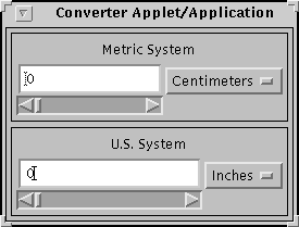 The program converts distance measurements between metric and U.S. units. Here, for the curious, is its source code. We do not expect you to fully understand the source code without reading the rest of this lesson and the relevant pages in the Using Components, the GUI Building Blocks