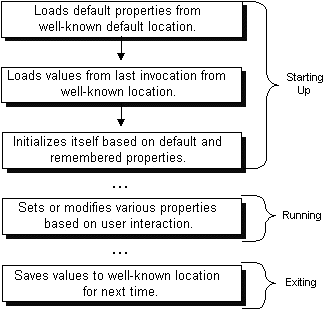 Propertiesobject and loads the properties that were saved from the last time the program was run. Many applications store properties on a per-user basis, so the properties loaded in this step are usually in a specific file in a particular directory maintained by this application in the user's home directory. Finally, the program uses the default and remembered properties to initialize itself.The key here is consistency. The application must always load and save properties to the same location so that it can find them the next time it's executed.