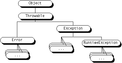 Throwableobjects; they are instances ofThrowableor a subclass ofThrowable. The Java packages contain numerous classes that derive fromThrowableand thus, build a hierarchy ofThrowableclasses.Your exception handler can be written to handle any class that inherits from Throwable. If you write a handler for a "leaf" class (a class with no subclasses), you've written a specialized handler: it will only handle exceptions of that specific type. If you write a handler for a "node" class (a class with subclasses), you've written a general handler: it will handle any exception whose type is the node class or any of its subclasses.Let's modify the