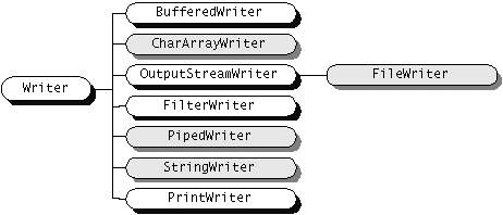 ReaderandWriterimplement specialized streams and are divided into two categories: those that read from or write to data sinks (shown in gray in the following figures) and those that perform some sort of processing (shown in white). The figure shows the class hierarchies for theReaderandWriterclasses.