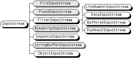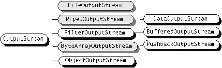 ReaderandWriter, subclasses ofInputStreamandOutputStreamprovide specialized I/O that falls into two categories: data sink streams and processing streams. Figure 56 shows the class hierarchies for the byte streams.As mentioned, two of the byte stream classes, ObjectInputStreamandObjectOutputStream, are used for object serialization. These classes are fully covered in Object Serialization.