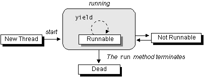The following diagram shows the states that a Java thread can be in during its life. It also illustrates which method calls cause a transition to another state. This figure is not a complete finite state diagram, but rather an overview of the more interesting and common facets of a thread's life. The remainder of this section uses the Clock applet previously introduced to discuss a thread's life cycle in terms of its state.
