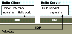 This tutorial teaches the basic tasks in building a CORBA distributed application using Java IDL. You will build the classic Hello World program as a distributed application, with both applet and application clients. The Hello World program has a single operation that returns a string to be printed. CORBA terminology and the underlying functionality of the application is discussed in The CORBA Architecture. The application diagram is repeated here, along with a review of the steps in the process of communication between the client and server.Communication between the client and server.